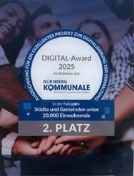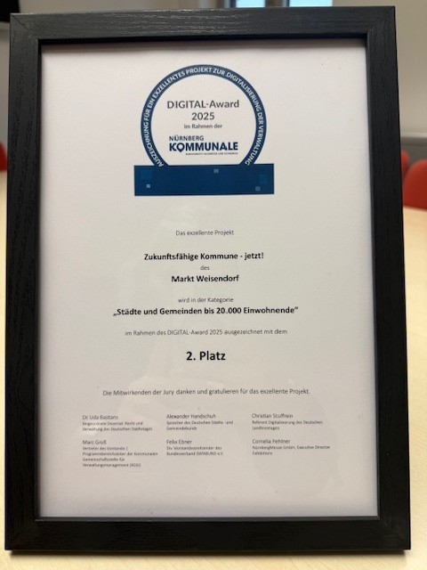 Beim DIGITAL-Award 2025, für den in diesem Jahr mehr als 70 Projekte eingereicht wurden, hat der Markt Weisendorf den zweiten Platz in der Kategorie "Städte und Gemeinden bis 20.000 Einwohnende" erzielt. Dies zeigt, dass auch kleine Gemeinden bedeutende Fortschritte in der Digitalisierung machen können. Ausgezeichnet wurde unser Einsatz für digitale Bürgerservices und moderne Verwaltungsabläufe, die den Alltag für unsere Bürgerinnen und Bürger erleichtern.